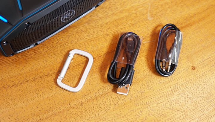There’s a carabiner/clip bracket on the right so you can hang the speaker wherever possible while on left there’s the micro-USB port for charging and the 3.5mm AUX port just in case you want to go wired. The ports are protected by a thick plastic flap cover since the device is IPX6 water and dustproof. It’s also shock resistant according to the manufacturer.