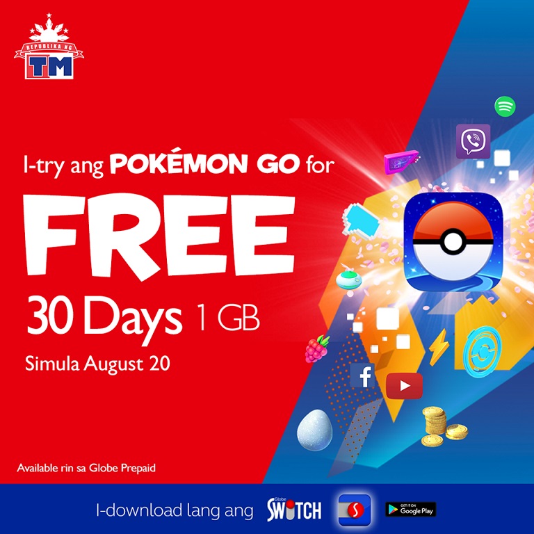Starting August 20, 2016, Globe and TM prepaid users can play Pokemon GO for free for 30 days or 1GB of mobile data allocation dedicated for the game.