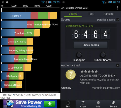 Quadrant benchmark score puts the Idol Ultra at 3,224 which is slightly low while the Antutu Benchmark gives it a 6,464 rating.