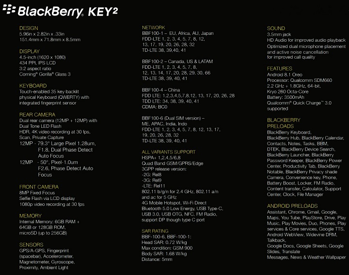 Blass once again posted the leak on his Twitter account. As for the specs, we have a 4.5-inch 3:2 aspect ratio FHD display, 35-key QWERTY backlit keyboard, Qualcomm Snapdragon 660 chipset, 6GB of RAM, 64 or 128GB internal storage, Android 8.1 Oreo, and a 3,500mAh battery. For the cameras, we have a dual 12MP rear setup and a single 8MP front. Of course, the device will have the iconic apps that build up the BlackBerry ecosystem. Check out the full leaked spec sheet below.