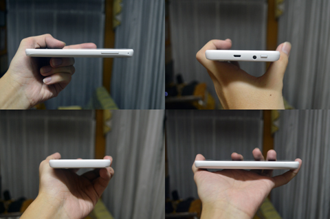 Found on the top left part of the phone is the power button alongside the place for the 3.5mm audio jack and the micro USB port, and on the right side of the phone is what seems to be the secondary microphone and the volume rocker; there is nothing found on both the bottom and the left side of the phone.