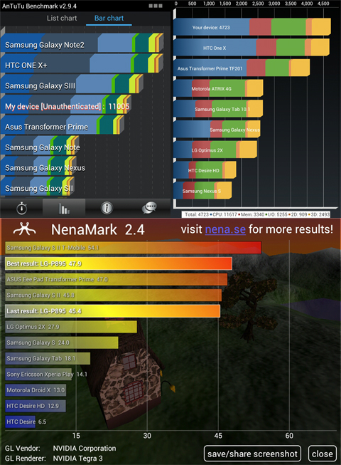 The LG Optimus Vu raged through the benchmarks with an 11,005 for Antutu, a 4,723 for Quadrant and 47.9 for Nenamark 2. The device is powered by a Tegra 3 quad-core processor and everything went smoothly.