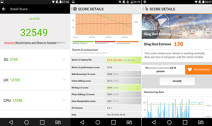 In chip-per-chip comparison, though, the MT6735 easily beats other lower-range chips such as the Snapdragon 410, and this has been evident: Overall performance with the X Power is good even in multitasking, and only occasional lags have occurred when playing casual games such as Zombie Tsunami or Hungry Shark Evo. Tolerable heat is felt when the phone is stressed out to the max, which happens to be at the lower back part. Here are some sample benchmarks: