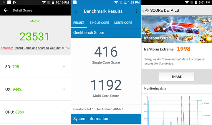Sporting 1GB of RAM and a quad-core Mediatek chip, the Motorola Moto C is decent for light to moderate use. You may play a few casual games here and there, but noticeably dropped rates occur on intensive ones happen such as on Hungry Shark Evolution. Gaming can push the Moto C’s hardware which results in heating which can be felt at the upper back part of the device. Here are results from a few benchmarks:
