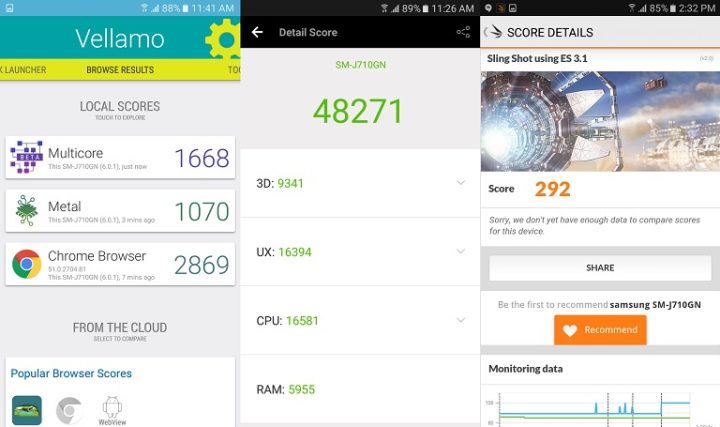 The Galaxy J7 (2016) is powered by a Samsung Exynos 7870 octa-core CPU clocked at 1.6GHz, Mali-T830 GPU, and 2GB RAM. Performance is smooth regardless of the task. Animations are smooth and switching between apps are fluid. Gaming is not an issue as it can handle graphic intensive games such as Asphalt 8. Check out the scores below.