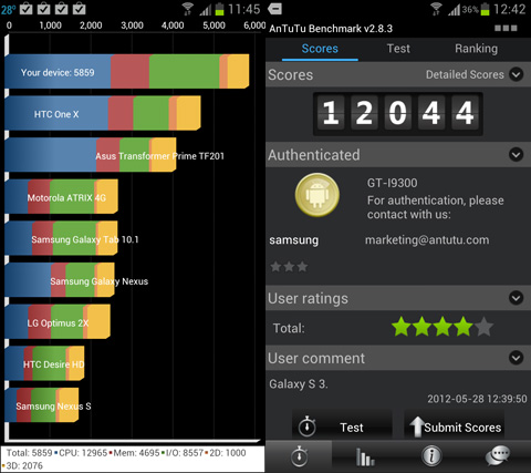 With a Quadrant score of 5,859, it’s the highest we’ve seen on any handset or tablet we’ve ever tested or reviewed. The same goes with Antutu benchmark — the S3 surpassed the 10k mark with a score of 12,044. The Nemark 2 score gave it an impressive 58.8fps rating.