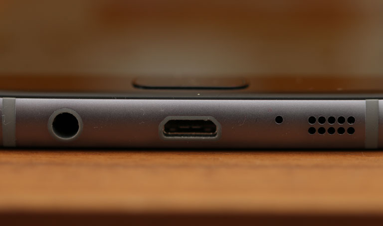 Beside it is the 3.5mm audio port and the loudspeakers. The less rounded home button also acts as the fingerprint sensor which scans up to 4 unique fingerprints. You can use the scanner to unlock the device, sign in to websites and make purchases on the Samsung app store.