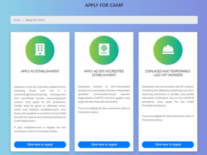 According to Labor Secretary Silvestre Bello III, the department developed an online system to streamline, simplify, and digitize the submission of applications of the affected workers. With the online system, applicants who for the DOLE CAMP may now track their application’s progress.