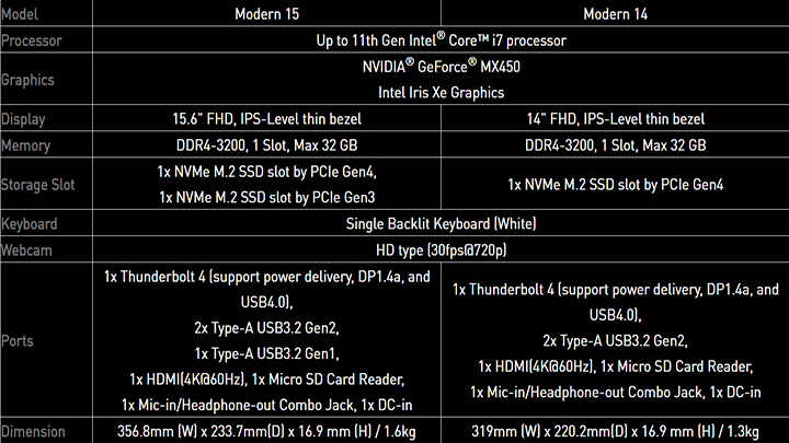 Meanwhile, the Modern series comes with either an Intel Xe or NVIDIA GeForce MX450 graphics card. It supports 32GB of LPDDR4 RAM, HD webcam, up to 11th Gen Intel Core i7 processor, NVMe M.2 PCIe Gen 4 SSD, and Thunderbolt 4 with USB 4.0 to boost output productivity.