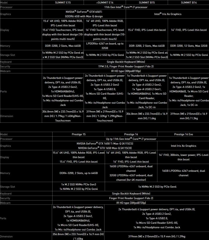 The Prestige series, on the other hand, features up to 11th Gen Intel Core i7 processor, up to NVIDIA GTX 1650 Ti Max-Q, up to 15.6-inch 4K UHD IPS display with 100% Adobe RGB color coverage, up to 64GB RAM, and up to M.2 NVMe PCle Gen4. The Prestige 14 Evo that runs on Intel’s latest Evo platform has an integrated Intel Iris Xe graphics card, 16GB of LPDDR4X RAM, one slot of M.2 NVMe PCle Gen4, and a 14-inch FHD display.