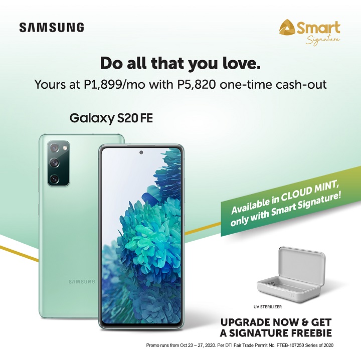 Those who will upgrade to Smart Signature and the Samsung Galaxy S20 FE via the Smart Online Store from October 23 to 27 will get a free UV Sterilizer with wireless charging worth PHP 2,199.