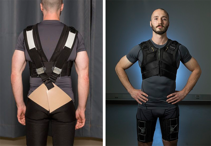 The device has been proven to reduce stress on the lower back, and works by engaging when you double tap your shirt, or by controlling it via an app on your smartphone. It is comprised of two sections of fabric that are worn on the chest and legs. Activating the device then offloads the stress your back would be taking, onto sturdy straps that connect the two fabric sections.