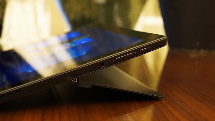 Lenovo’s watchband hinge is present here and is used with the tablet’s kickstand. Like with the Yoga notebook series, you can freely set the angle of the slate. It doesn’t go full flat but it leans back enough for different positions up to 170°.