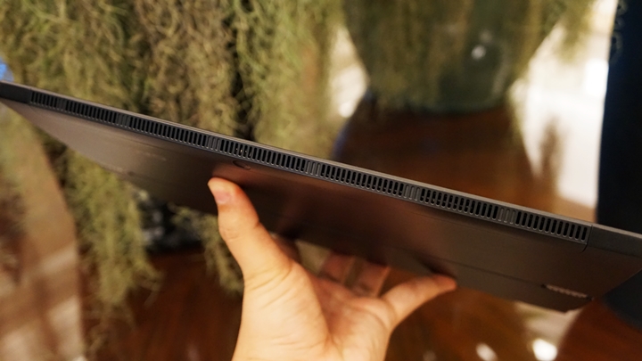 The left side of the slate houses the USB-C 3.1 port, USB 3.0 port, and the DC-in for charging. The left speaker grille is positioned to the lower end.