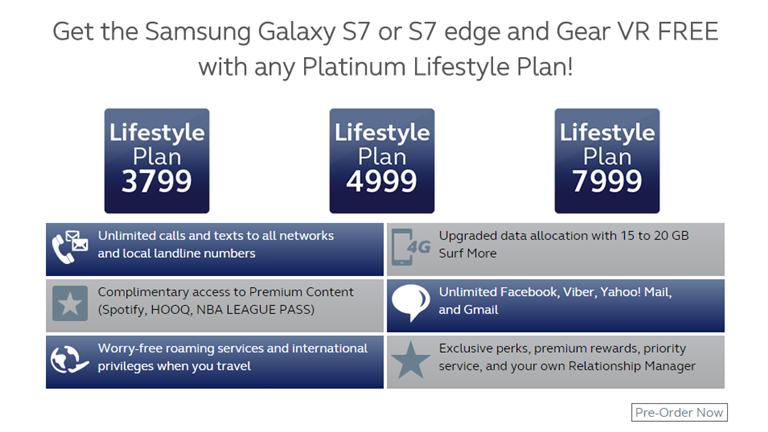 The Samsung Galaxy S7 and S7 Edge is available for FREE on any Globe Platinum Lifestyle plans and it comes with a free Gear VR. Plans come with all the perks and privileges from Globe including dedicated platinum service, worldwide concierge, and exclusive benefits.