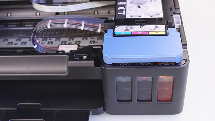 Canon made the ink tanks integrated to the body to save space and achieve a cleaner look. There are three tanks for cyan, magenta, and yellow on the right while on the opposite end is for the black ink with a bigger container.