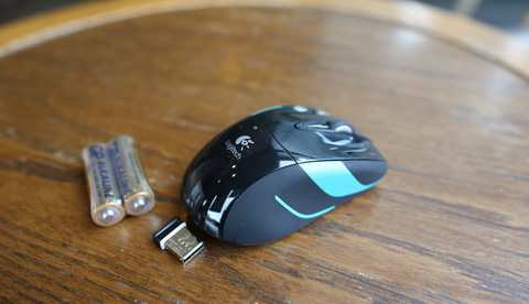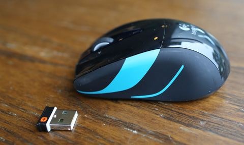 Th M525 is powered by two AA batteries. The rear top-side pops open to show the battery compartment and the wireless USB receiver. The receiver is now much smaller than the previous one and the compact size makes it more convenient to use when plugged into adjacent USB ports (doesn’t get in the way of the neighboring USB port).